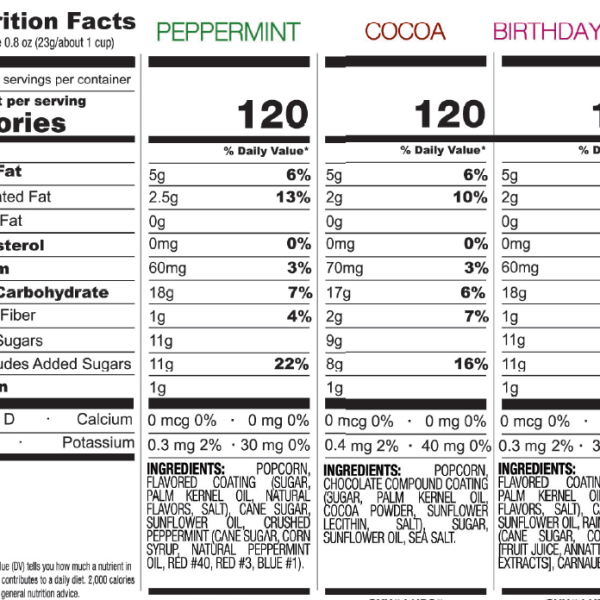 -4 Dark Cocoa Kettlecorn. 3 Birthday Cake Kettlecorn. 3 Peppermint Kettlecorn