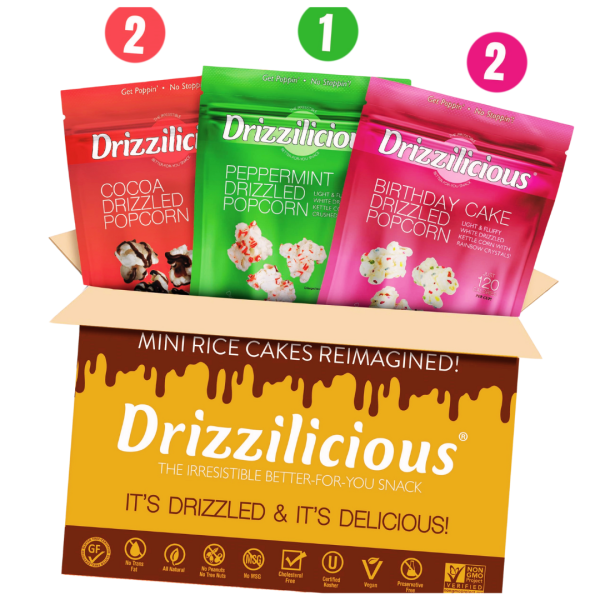Our 3.6oz?3 flavor?Drizzled Popcorn Variety 5 Pack?is the perfect size to munch on solo. or with a few friends!?