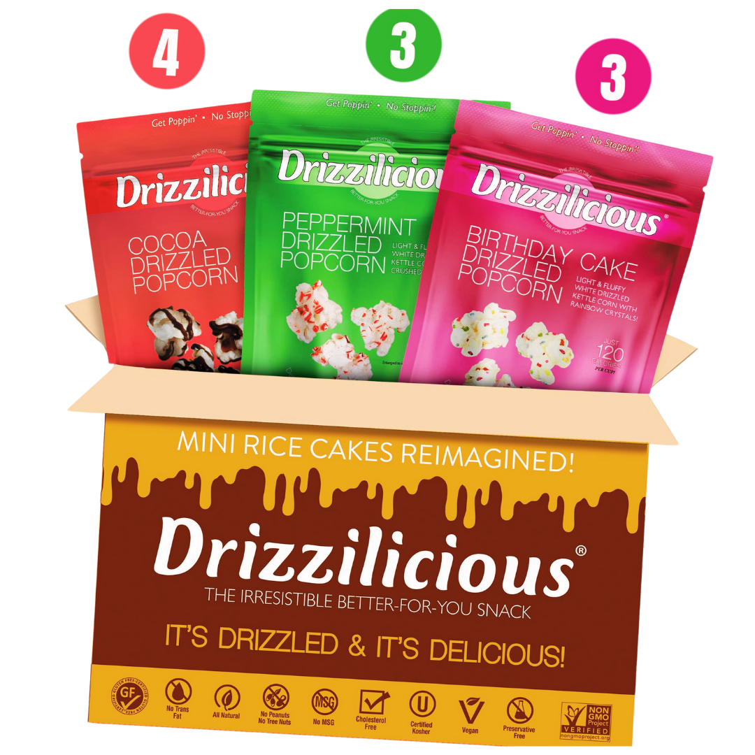 Our 3.6oz?3 flavor?Drizzled Popcorn Variety 10 Pack?is the perfect size to munch on solo. or with a few friends!?
